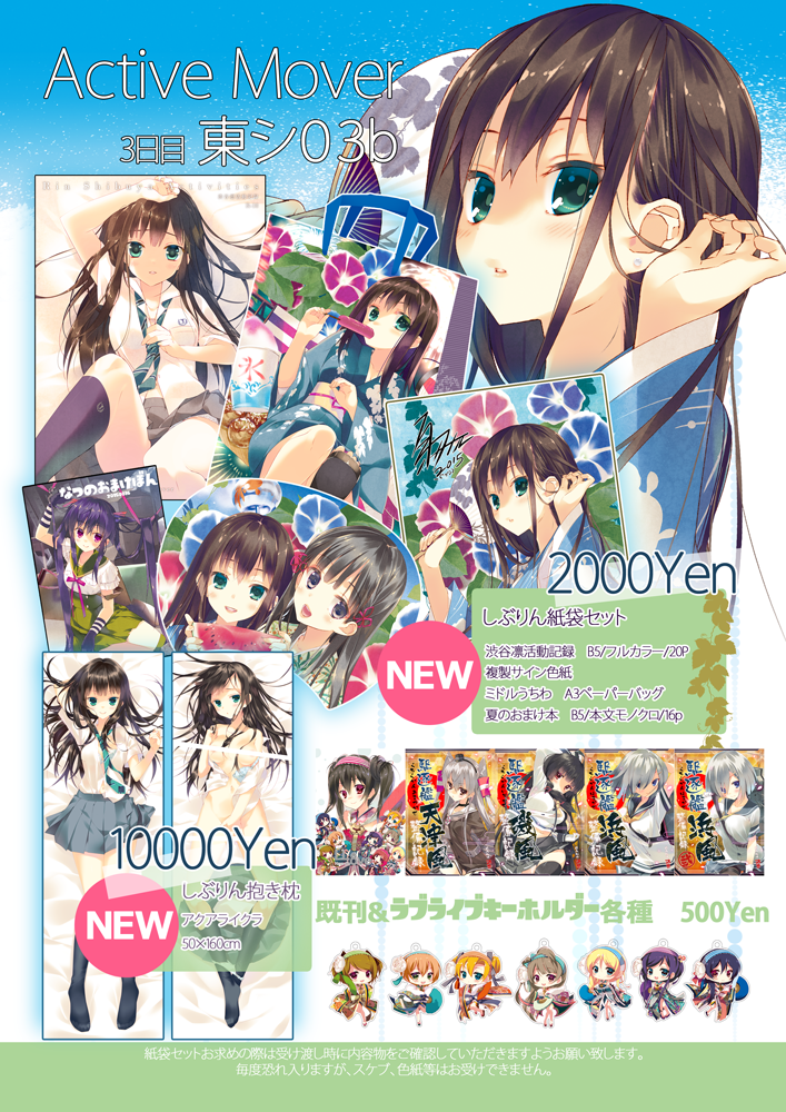 2015年08月10日 C88 プライスリスト。 すべてのグッズ、新刊が入稿を終えましたので告知いたしますc(:3c )っ三日目 東シ03bActiveMover※8月11日既刊誌を追加したものに差し替えました。こちらがコミックマーケット3日目当日の出展目録です。本に関しましてはしぶりん本のみ単品頒布(500円)があります。おまけ本の単品頒布はありません(セットに付録)それでは改めて、頒布物の画像を張っておきます。新刊「渋谷凛活動記録」フルカラー20Pセット付録のおまけ本 本文モノクロ16ページセット付録の複製サイン色紙セット付録のミドルうちわセットを入れるショッパーの絵柄です。裏面は346プロのロゴになっています。